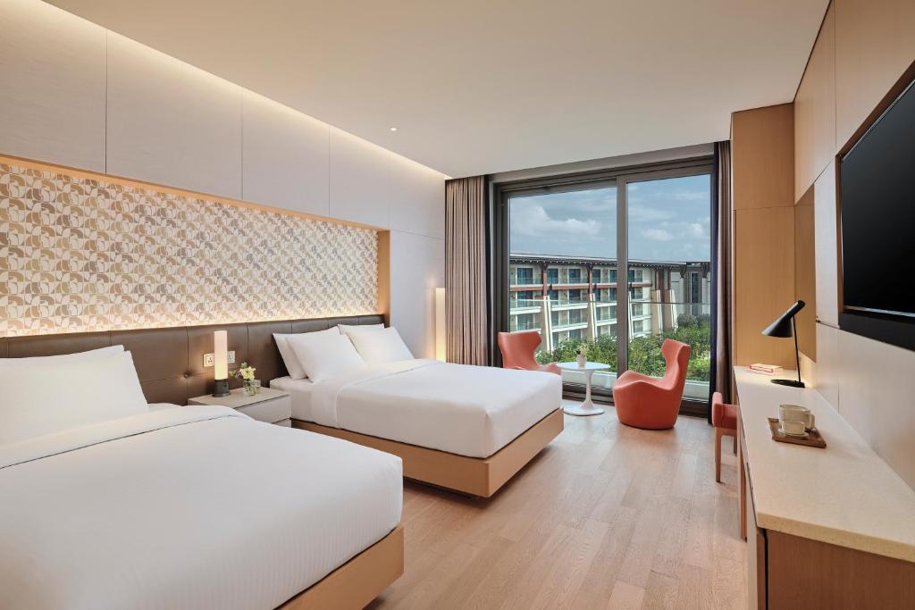 At Jeju Shinhwa World Landing Resort, guests can choose from a variety of thoughtfully designed room types that cater to every need and preference. The spacious Connected Room, measuring 54 square meters, is perfect for families or groups, offering the flexibility of either a King Bed or two Single Beds. For those traveling with loved ones, the Deluxe Family Twin provides a cozy atmosphere with options for a Single Bed or a Queen Bed, ensuring comfort for everyone. Couples will find the Deluxe King room an inviting retreat, featuring a plush King Bed in a stylish setting. Meanwhile, the Superior King and Superior Twin rooms, both elegantly appointed at 27 square meters, offer intimate spaces with a choice of a King Bed or two Single Beds, making them ideal for solo travelers or friends seeking a tranquil getaway.