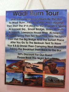 Very good WiFi. Excellent buffet dinner for only 5 JD. Ride to & from Petra each morning & afternoon. Packed lunch for only 2.5 JD.